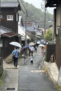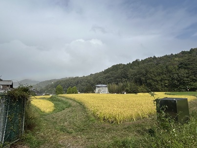 座学が終わり、次は田圃の見学です。500m位離れた場所まで、両脇に茅葺屋根のある道を歩きました。残念ながら小雨の中で、秋晴れの船坂を楽しんで貰えませんでしたが、このイベントの為に、刈り取らずに置いてあった田圃は見事な黄金色でした。