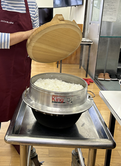 座学を聞いている間にスタッフの方が、グラウンドに設置した簡易的なかまどに羽釜を据えて火を付けられていました。