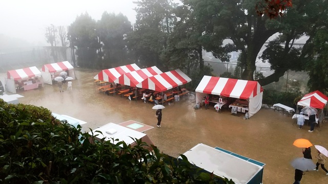 会場オープンは10:30。早めの10時に到着すると運動場は既に水浸しで普通に歩くのが困難な状態。キッチンカー(地元店のリトルランカは今年も出店♪)や地元スタッフ等の販売テント(焼きそば・おでん・洋菓子和菓子・ポップコーン・焼き芋など)の準備は進められていたものの、全体的に雰囲気が重め。恨めしそう位空を仰ぐスタッフの姿もありました。ランチルームは船坂そばの準備でそば打ちをしてました。