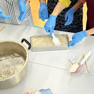 さて、こんにゃく作りですが、下茹でされたこんにゃく芋をミキサーにかけ、水酸化ナトリウムを入れて手早くかき混ぜると、混ぜるほど固くなってきます。程よく固くなるまで皆さん中々の力仕事のようでした。