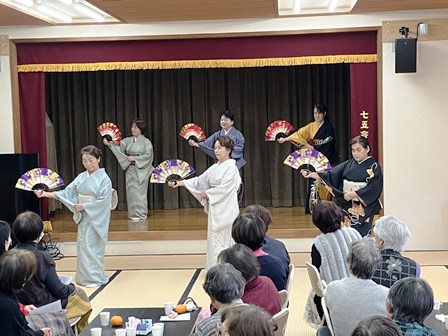 その後、お弁当やビール、お酒等新年の会食を楽しんで頂き、今日のメインイベント「日本舞踊山村流夢扇会」の方々7名による日本舞踊を鑑賞させていただきました。年始にふさわしい曲目を含む8曲を美しい着物で流れるような動作、曲に合わせて情緒たっぷりに踊って頂きました。山村先生のファンの方も見つめる中、安定感のある立ち姿の美しさ、指先まで思いを込められている踊りに初めての私も感動いたしました。